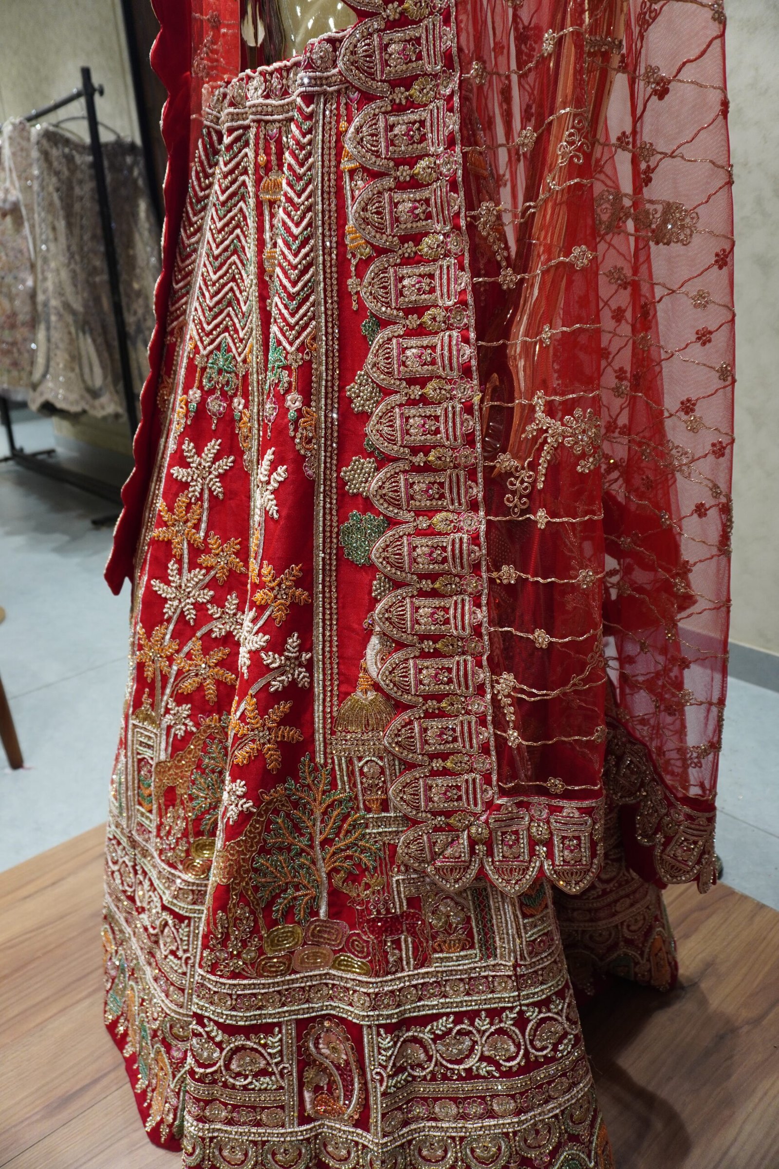 Lehenga Flair: Heavy flare with multi-pattern hand embroidery